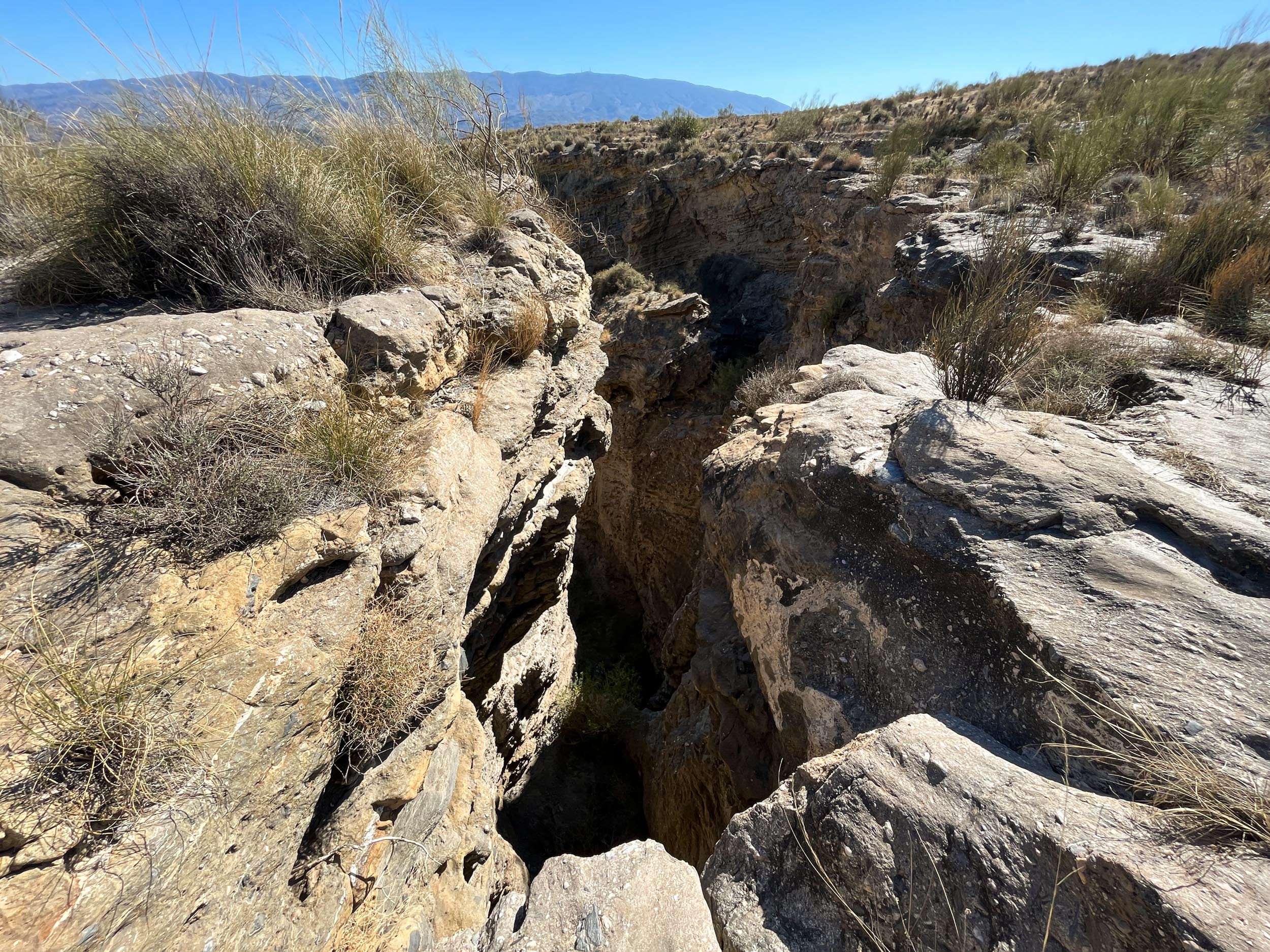 A deep, narrow rocky gorge / valley with large, jagged rocks in a barren, arid landscape. A light-coloured gravel path runs along the top, whilst fields lie in the valley.