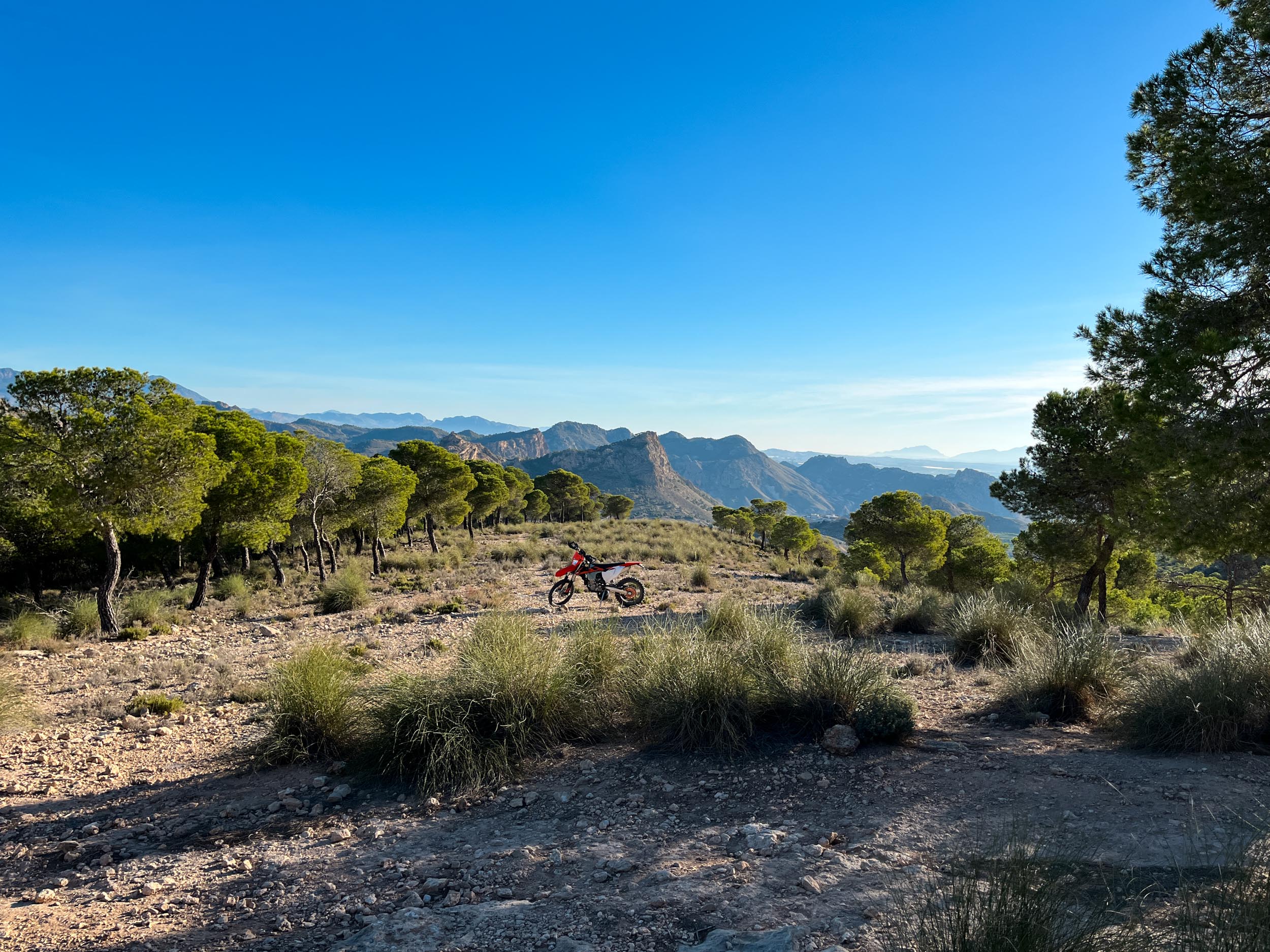 A wide, well-maintained, winding gravel path made of sand-coloured and red stone, with small parking bays. It winds through wooded hills with rocky outcrops and offers views of rock formations in the valley.