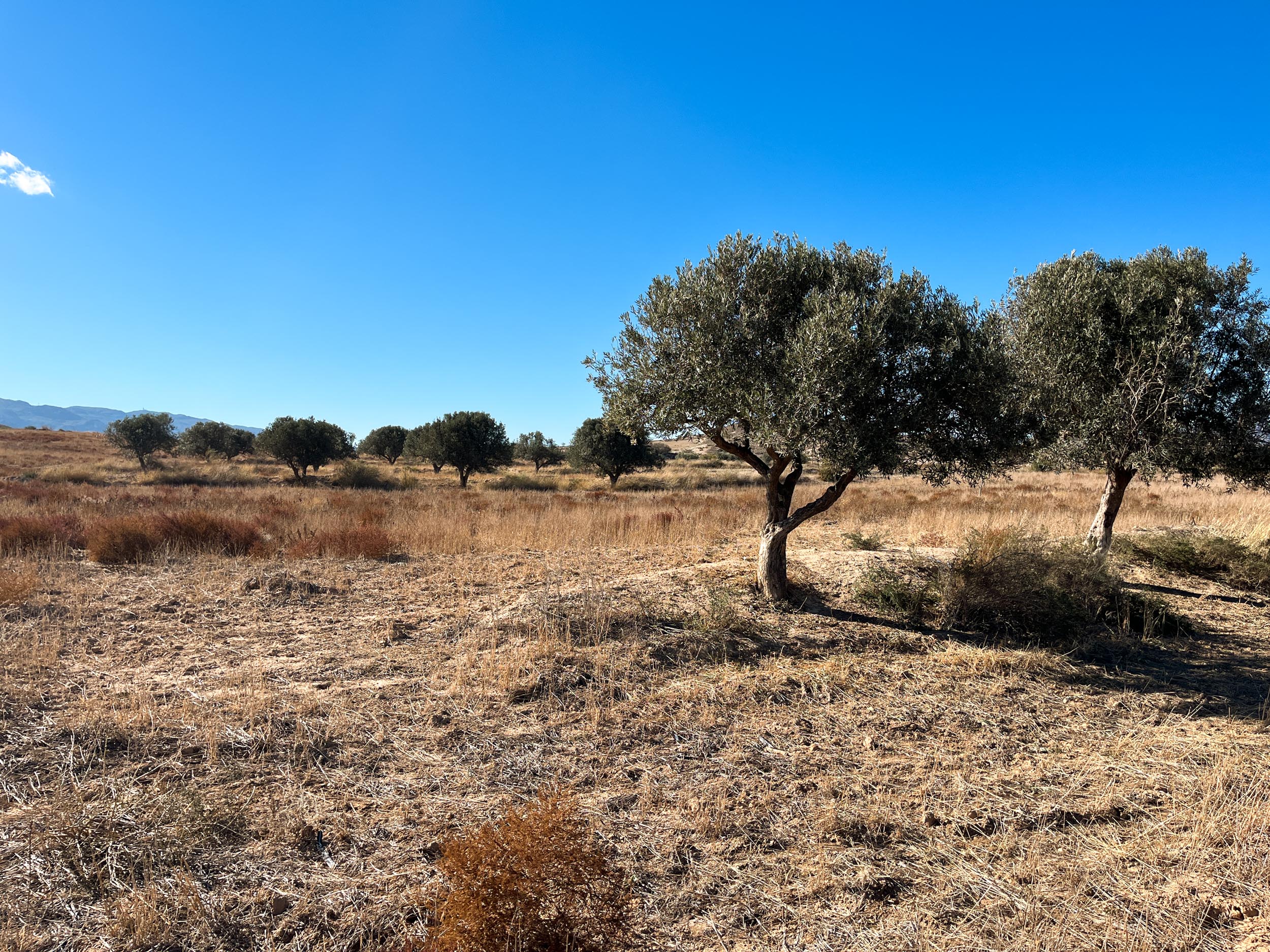 Flat, overgrown, terraced farmland covered in grass, with six rows of olive trees spaced far apart.