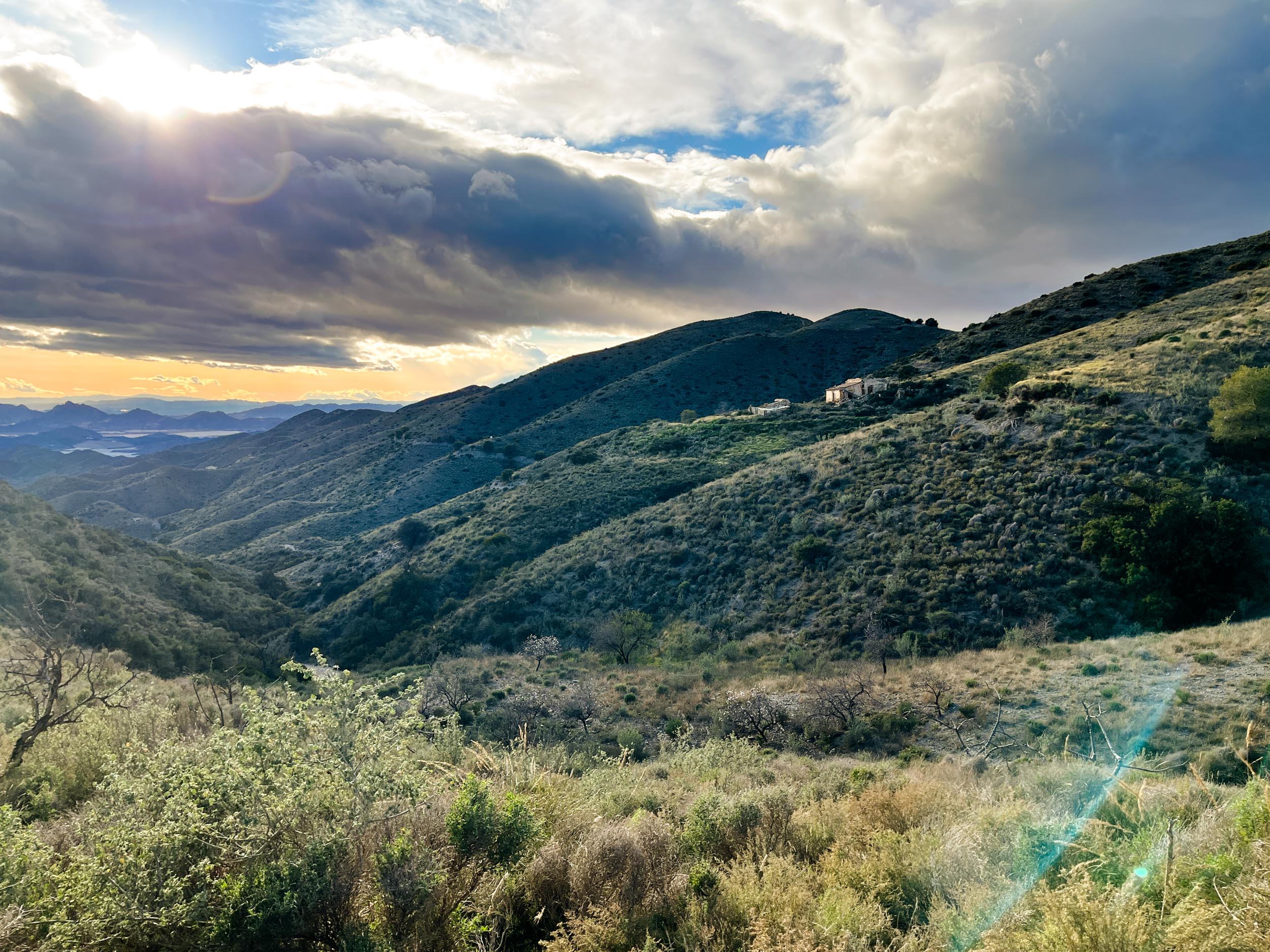 A solitary, small farmhouse ruin with a flat open area in an elevated position on the hillside. Dry vegetation consisting of grasses and shrubs. A view across the entire region as far as the sea.